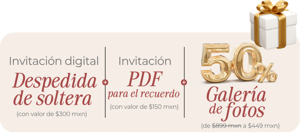 Términos y condiciones: Oferta válida para nuevos contratos en pago en una sola exhibición con transferencia bancaria, deposito en OXXO y cajeros BBVA. Precio publicado aplica únicamente para el Paquete Clásico e incluye un regalo a elegir: invitación digital ‘Save the Date’ o ‘Bridal Shower’. El descuento del 20% en la galería de fotos se aplicará sobre el precio estándar de la galería, siendo el cliente responsable de cubrir el costo proporcional. Los regalos incluidos son válidos solo para eventos programados en 2025. Si tu evento es en 2024, se aplicará únicamente el descuento en el paquete.
