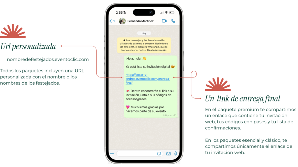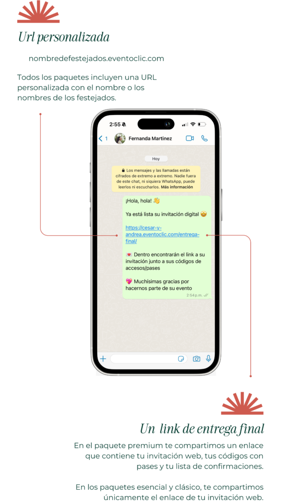 La mayoría de nuestra comunicación será por WhatsApp y, en algunos casos, por correo electrónico. Si tu paquete incluye una ronda de ajustes, el día de la entrega te enviaremos la invitación para revisión. Si es necesario realizar ajustes, los haremos. Una vez aprobada tu invitación, te enviaremos el enlace final.