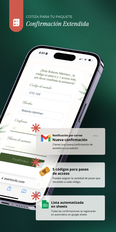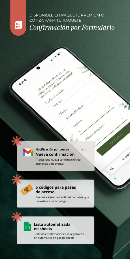Dependiendo del paquete que elijas, la invitación incluirá un tipo de confirmación de asistencia específico.