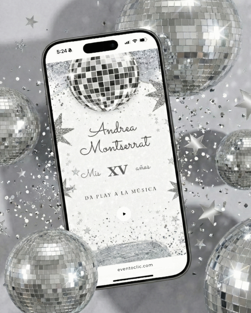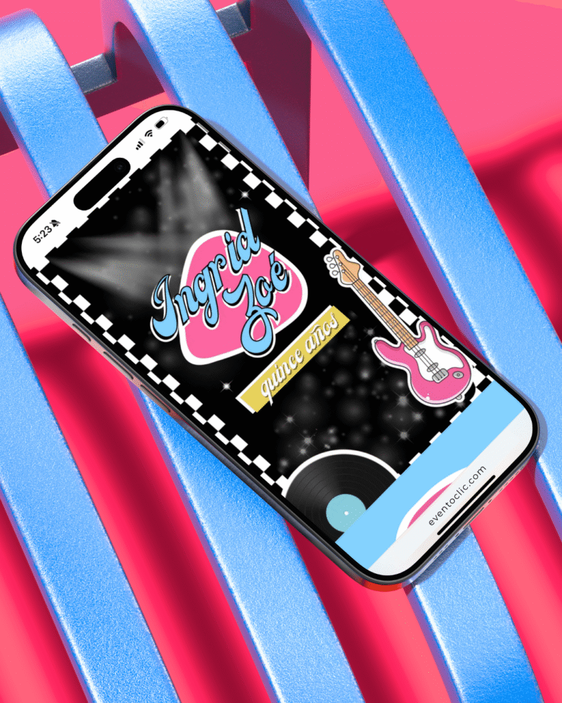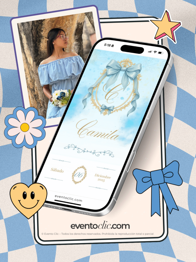 Nombre de la quinceañera, fecha, horarios y todos los detalles importantes del evento.