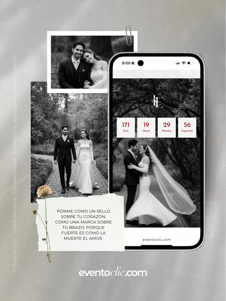 Nombres de los novios, fecha, horarios y todos los detalles importantes del evento.