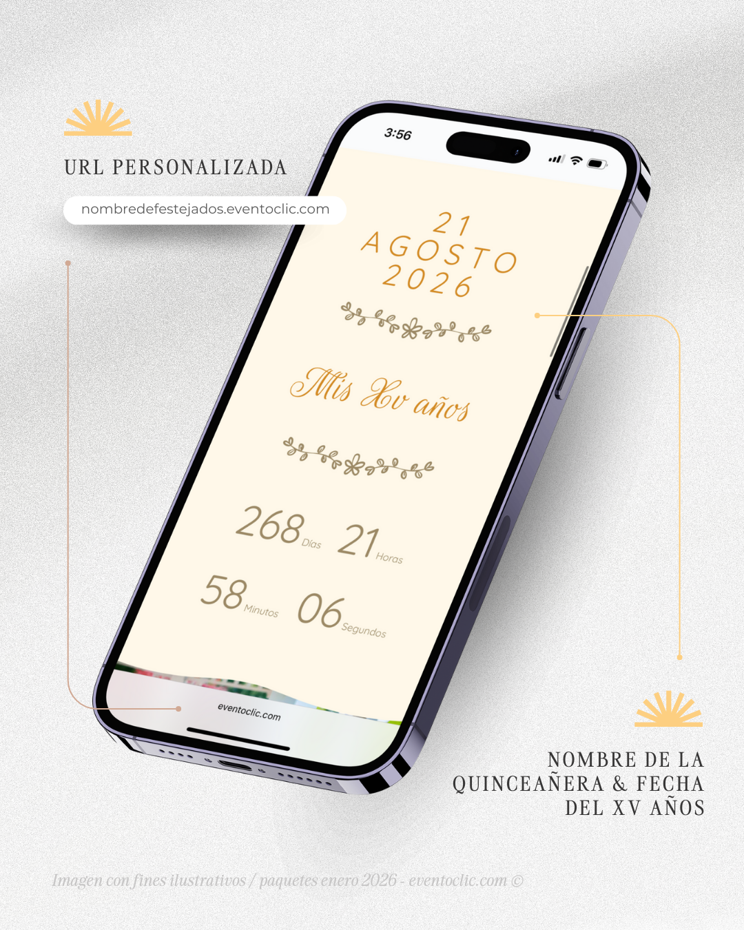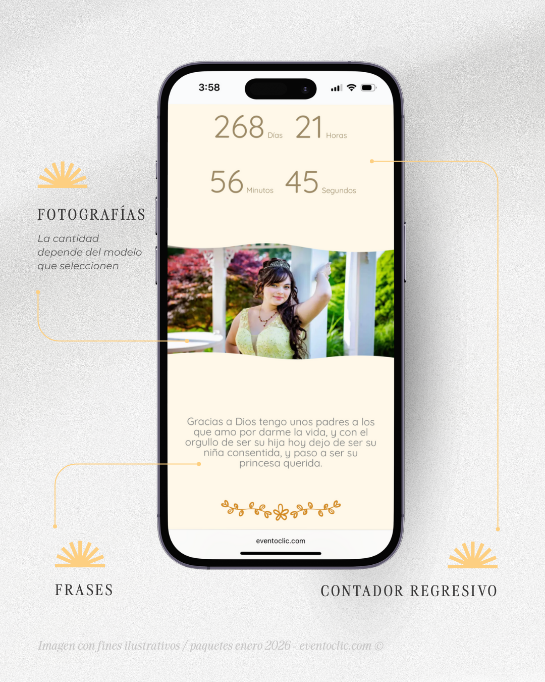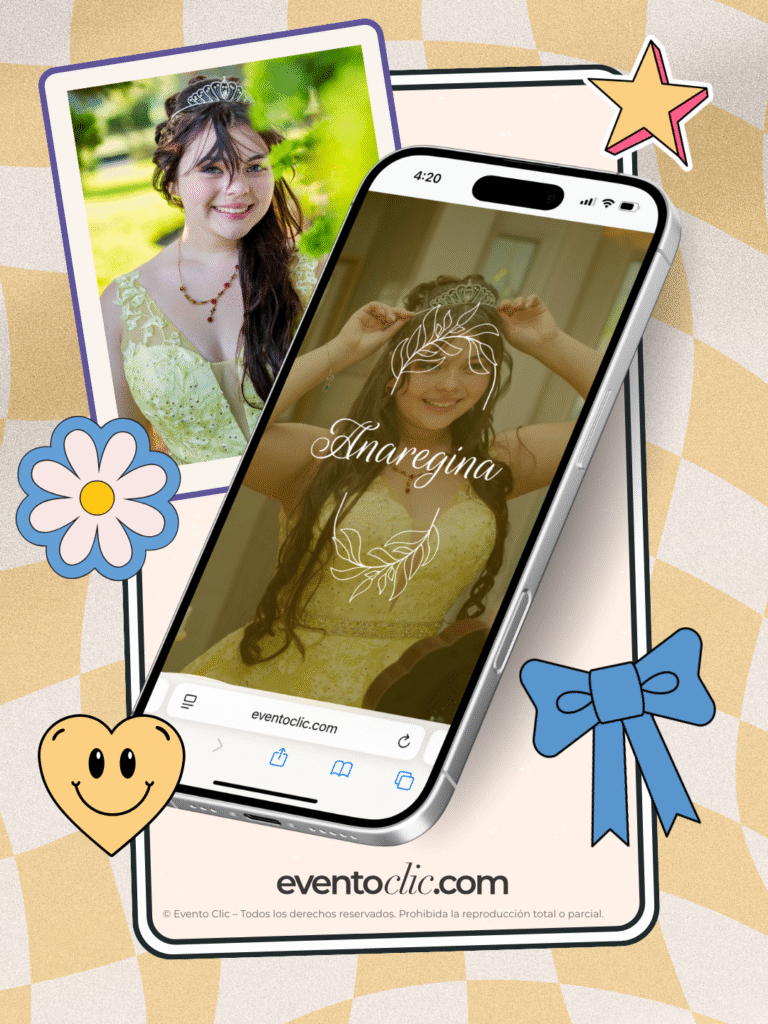 Diseño basado en nuestros modelos de catálogo, personalizado con los colores, textos y fotografías de los XV años.