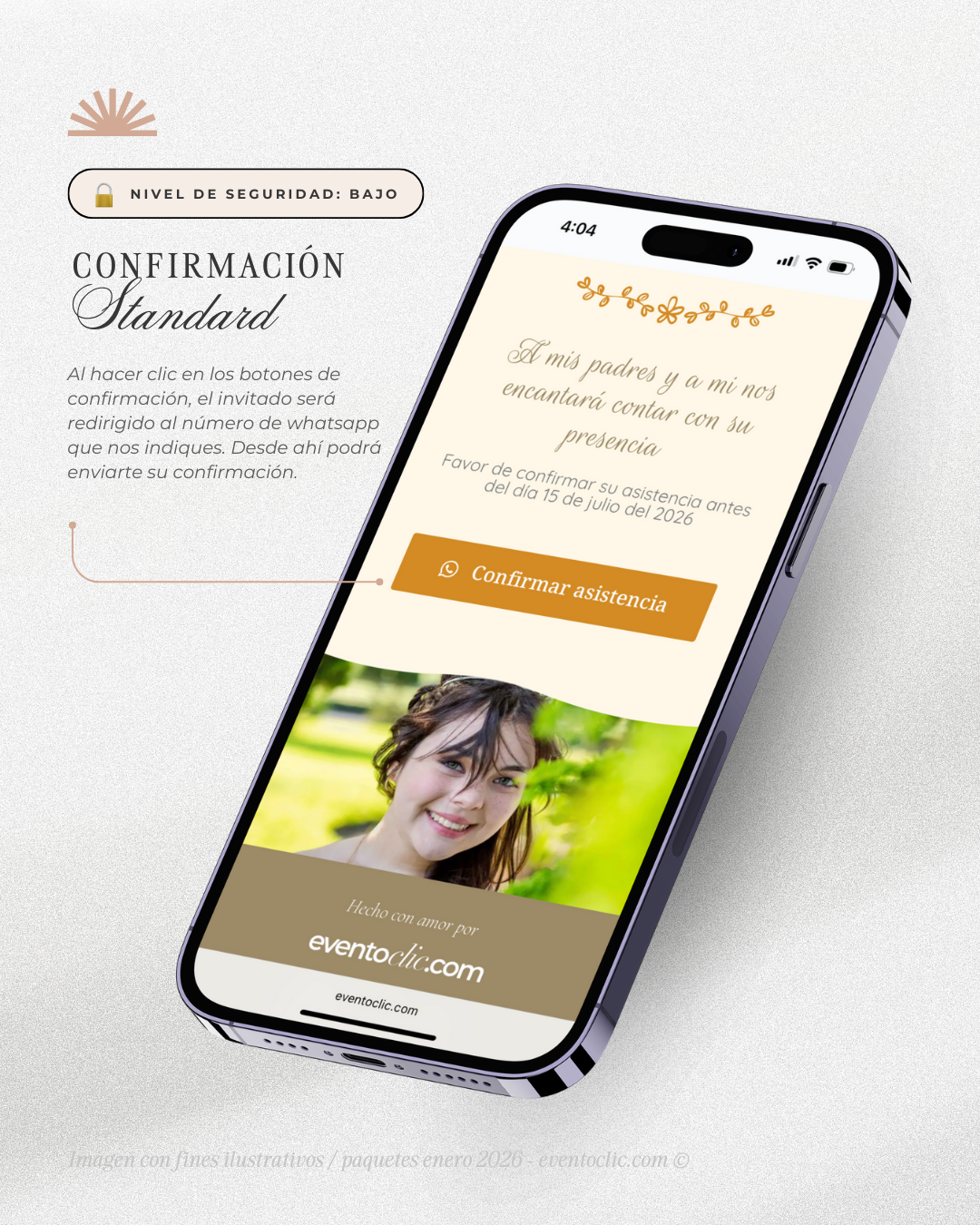 Los invitados confirman su asistencia enviando su mensaje directamente a tu WhatsApp, de forma simple y rápida.